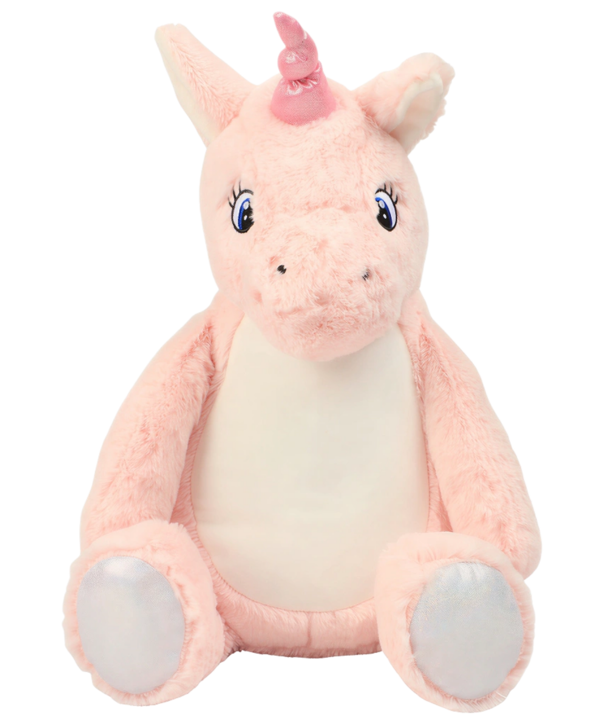 • Genuine Mumbles Zippie Unicorn plush toy • Soft plush unicorn with contrast feet and horn • Contrast mane and tail • Sewn eyes for added safety • White tummy panel perfect for decoration • Zip access at base for direct access to tummy • Removable inner stuffing for easy decoration • Suitable for embroidery, sublimation printing and DTF transfers